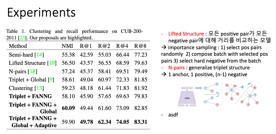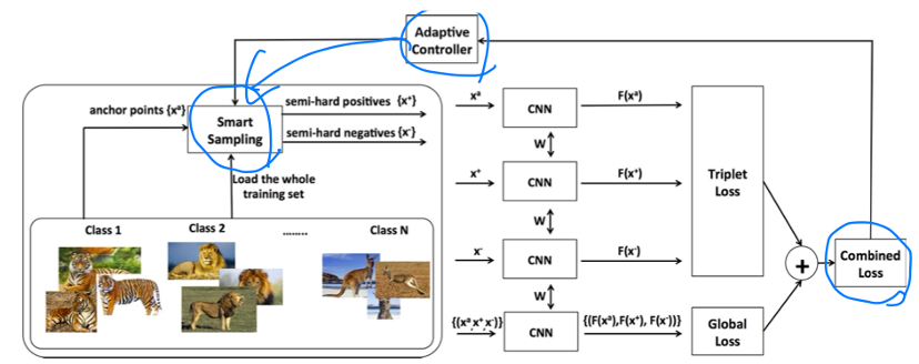 기존의 triplet loss와 각각의 anchor, pos, neg의 feature를 통합한 global loss를 합쳤다. 그리고 smart sampling 방식을 이용해 low computational complexity에도 위에서 언급한 바와 같이 anchor와 가까운 negative, 먼 positive를 뽑아낼 수 있다고 한다. 마지막으로 smart sampling을 할 때는 hyper-parameter 'k'가 있는데 이를 adaptive하게 조절할 수 있는 방법을 제시했다.