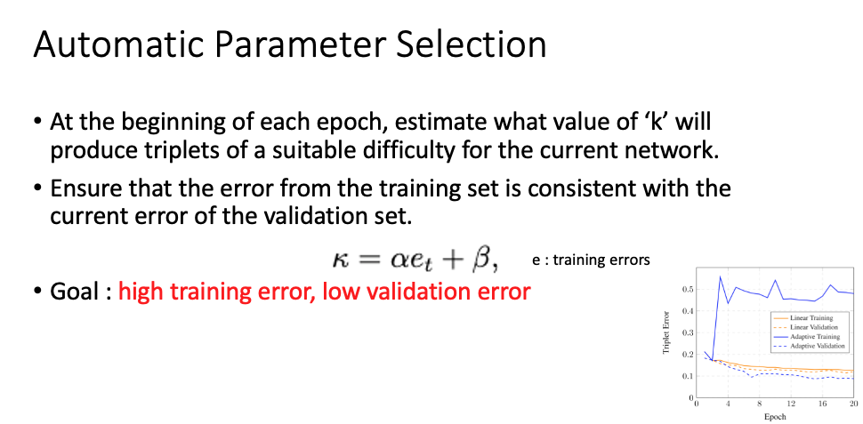 hyper-parameter 'k'는 현재 네트워크에서 충분히 어려운 positive, negative를 뽑을 수 있도록 한다. 그래서 각 epoch 시작마다 'k'값을 estimate한다. 이때의 회귀식을 사용하는데 목적은 high training error, low validation error이다.
