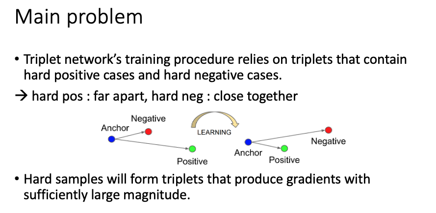 triplet loss를 사용하여 학습시키는 방법의 경우 학습 대상이 되는 데이터 선택이 중요하다. 위의 이미지에서 볼 수 있듯이 anchor와 가까운 negative와 먼 positive간의 거리를 계산하여 positive를 가깝게 negative를 멀게 만들어 준다. 하지만 random choice 또는 해당 anchor에 대해 모든 positive (same label)가 anchor와 이미 가깝다면 loss 값은 0이 되어 불필요한 연산을 하게 되는 것이다.