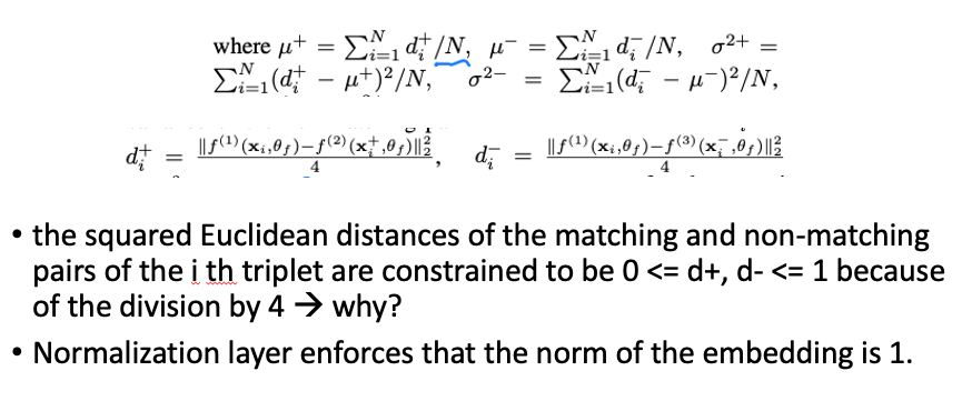 우선 각 anchor에 대한 positive와 negative 값 간의 euclidean distance로 평균 거리를 계산한다. 이때, 4로 나눠서 0보다 크고 1보다 작게 한다고 하는데 왜 그런지는 아무리 찾아봐도 모르겠다. (교수님께 여쭤볼 예정) 어쨌든 이렇게 구한 각 pos, neg에 대한 거리 평균 값으로 positive는 줄어들게 negative는 멀게 한다. 그리고 두 pos, neg에 대한 분산이 줄어들도록 한다. (두 개 분포의 분산을 줄인다면 어떤 장점이 있는지?)