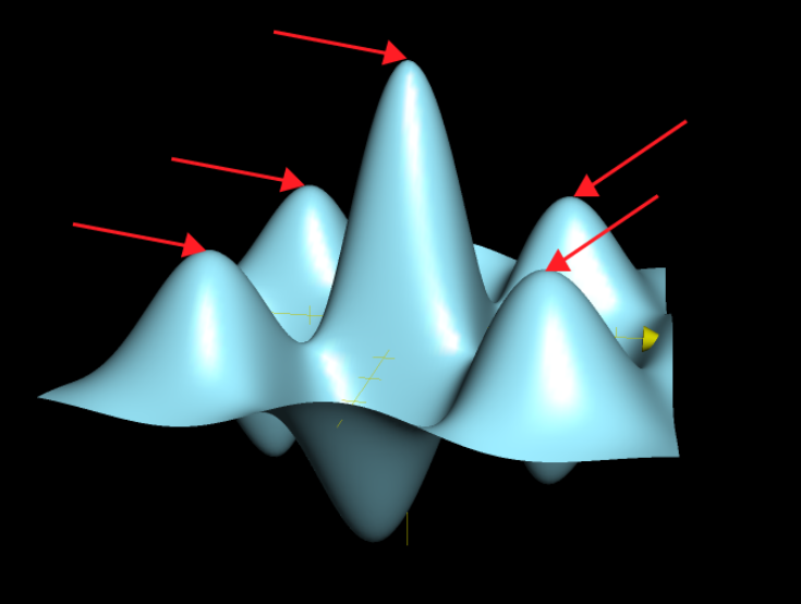 - scalar 값을 output으로 가지는 다변수 함수를 아래와 같이 떠올릴 수 있다. 이때, 각 꼭짓점들을 local maximum이라고 일컫는다.