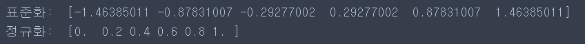 - 특성의 평균을 0, 표준편차를 1로 하여 정규분포와 비슷한 특성을 가지도록 한다.