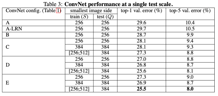 - Single scale (fixed S) : VGGNet used 2 single fixed scale (256, 384). Train the network using S = 256 and trained S = 384 with pre-trained weights with S = 256.