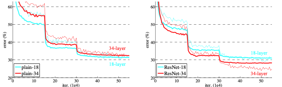 - Between 20 and 56 layers 'plain' convolutional networks, the deeper network has higher training error and test error.>