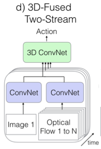 마지막 conv layer이후에 spatial과 flow stream을 결합한 3D-fused two-stream도 있다. time, x, y dimensions가 3x3x3 3D conv layer(output 512 channels), 3x3x3 3D max-pooling layer, fc layer를 통과하는 형태로 논문에서는 실험에 사용하였다. two-stream, 3d-fused two-stream 모두 end-to-end 방식으로 train했다.