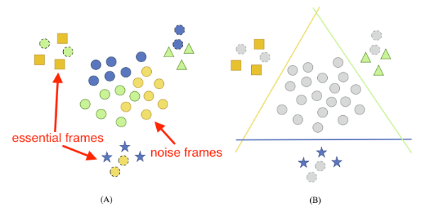 별, 삼각형, 사각형이 essential frames이고 그 외의 원형이 noise frames이라고 생각한다. (A)에서는 noise frames이 essential frames을 추출하는데 방해가 되는 것을 시각적으로 표현했다. 그래서 (B)와 같이 noise frames을 제외하거나 weight을 적게 주어 essential한 frames을 추출하는 것이 목표이다. 저자는 이 개념을 위의 그림과 함께 표현했다.