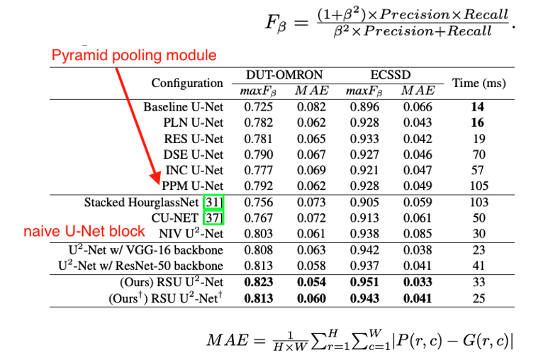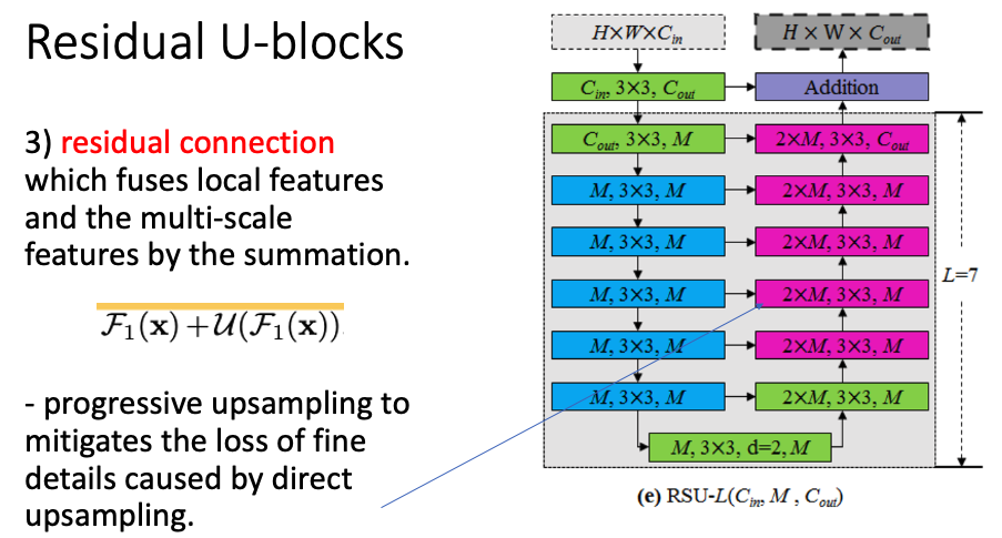 RSU는 intra-stage multi-scale features를 찾아낸다. 총 3가지로 구성된다. local feature extraction을 위해 input을 평범?한 conv layer에 넣고 해당 값을 최종 output shape과 같게 한다. encoder-decoder를 동일한 크기로 쌓아서 점진적인 downsampling을 통해 multi-scale feature를 뽑는다. 마지막으로 residual connection을 사용해 각각의 scale에서 추출된 local feature를 추가한다. 또한, 순차적으로 upsampling하여 정보 손실을 막는다.