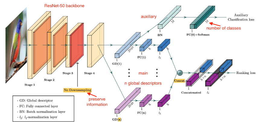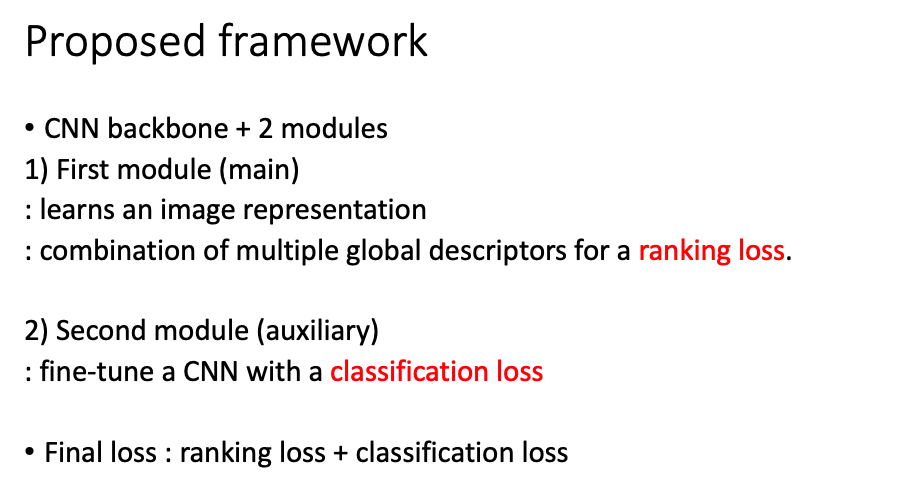 간략하게 설명하자면, 첫번째 module은 main module로 image representation을 학습하고 2 개 이상의 global descriptors를 통해 ranking loss를 구한다. 그리고 두번째 module은 CNN을 학습시키기 위한 auxiliary(보조) module이다. 이때는 classification loss를 사용한다. 최종 loss는 위의 두 loss를 합친 것을 사용한다.