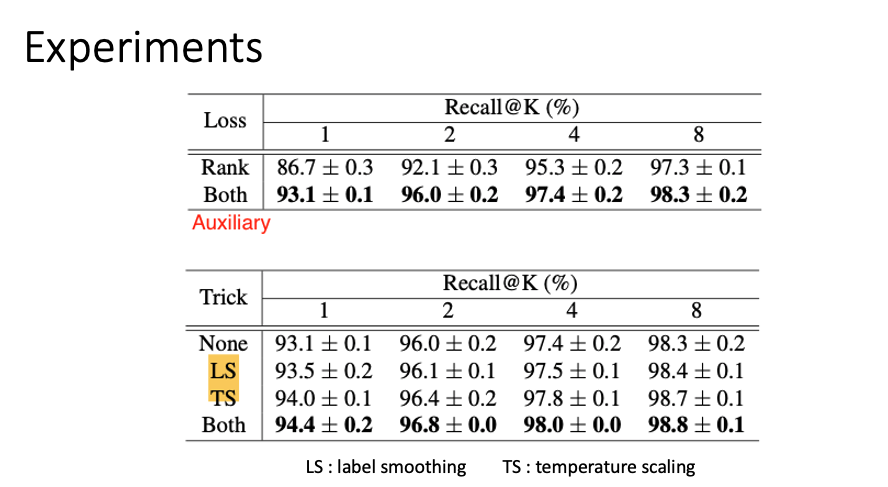 auxiliary module에서는 첫번째 global descriptor를 이용해 classification loss를 구한다. 이때 temperature scaling과 label smoothing을 적용한다.