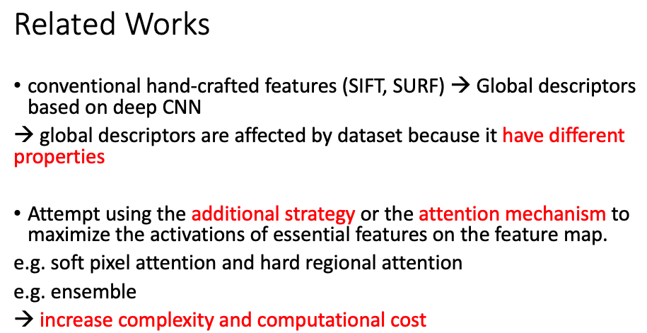 deep learning을 사용하기 이전에는 hand-crafted feature를 뽑아내는 SIFT, SURF 등의 기법이 많이 사용되었다. 이는 local한 정보에 집중하는 단점이 있다. 그리고 여러 global descriptor는 활용하는 dataset의 특성에 따라 결과와 성능이 다르다는 단점이 있다.