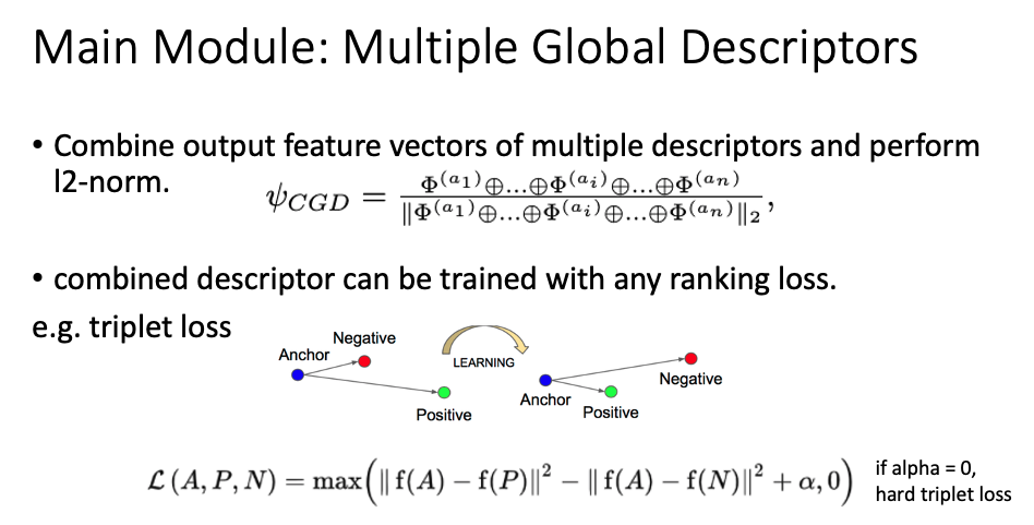 따라서 해당 논문의 저자는 multiple global descriptor를 combination하는 방식으로 end-to-end 방식으로 학습하였고 sota 성능의 모델을 만들었다고 한다.