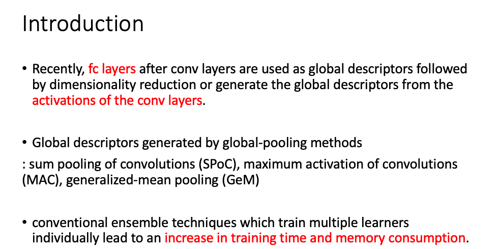 convolution layer를 통과한 이후 fully connected layer를 global descriptor로 사용한 후 차원 축소하는 방식 있다. 또한, 마지막 convolution layer의 activations으로부터 생성하는 방식도 있다. 이를 이용해 image retrieval을 위해 유사한 이미지를 찾아내는 것이다. 성능 향상을 위해 ensemble 기법이 많이 사용되고 있는데 기존의 ensemble 기법은 각 learners를 독립적으로 학습시키기 때문에 연산량이 과한 단점이 있다.