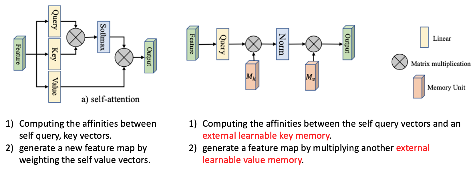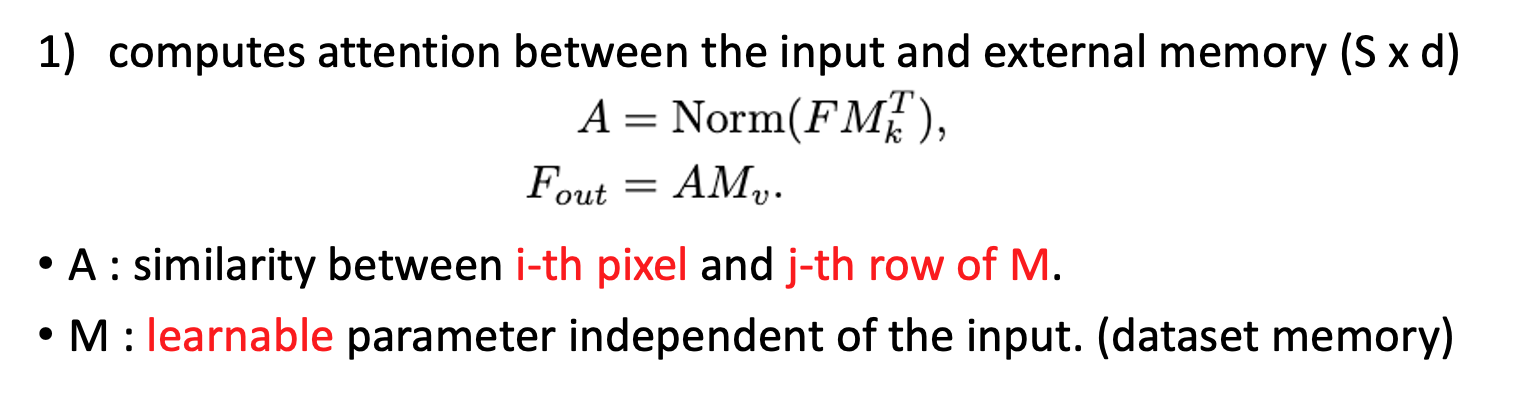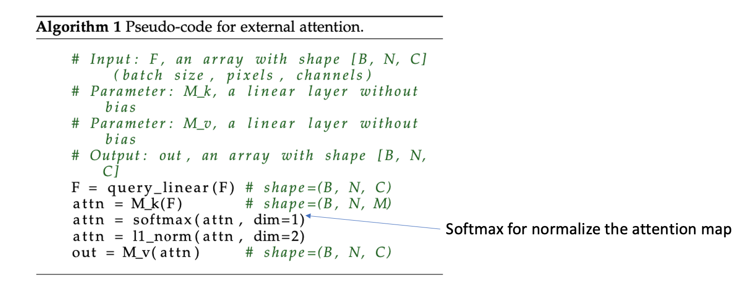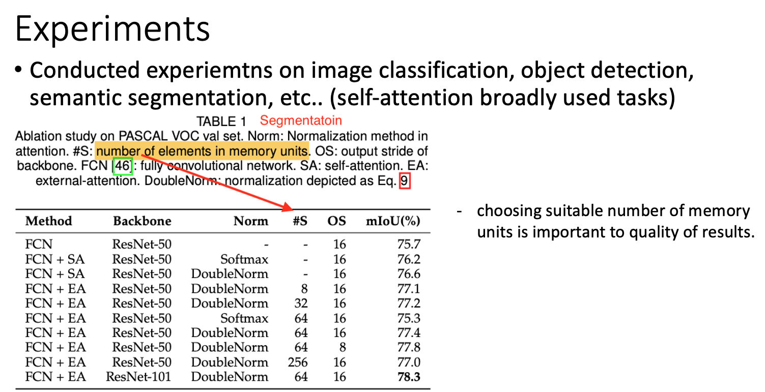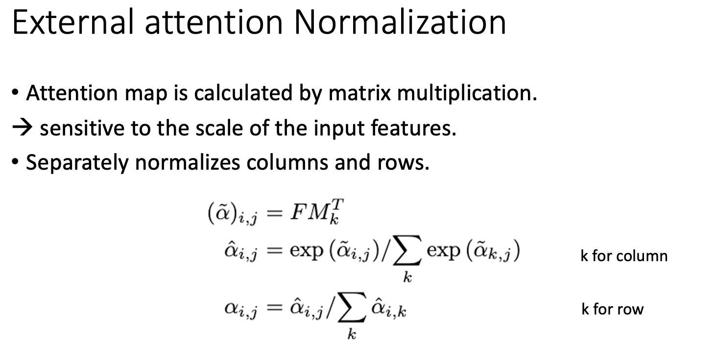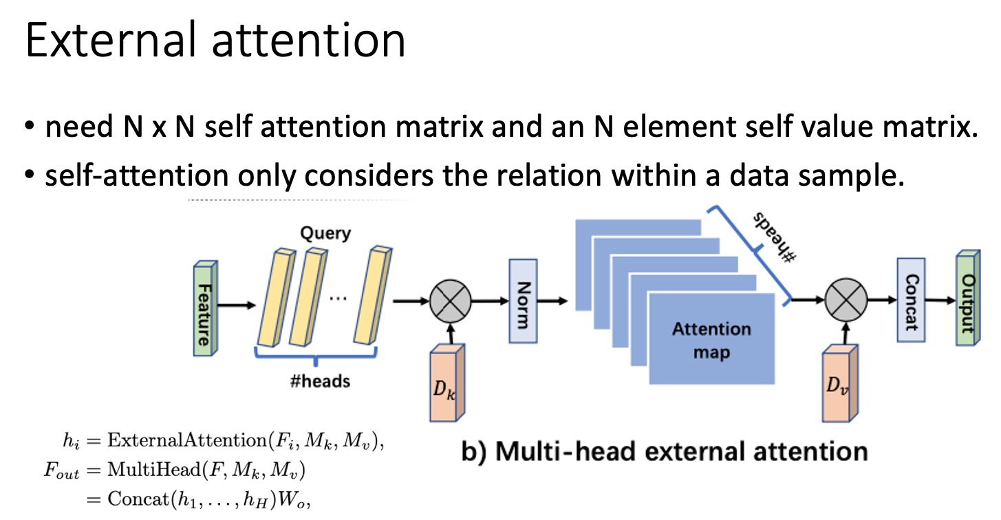 external attention을 사용함으로써 사용 memory가 적어지고 데이터셋 내의 데이터 간의 공유가 가능하여 regularization role을 하기도 한다.