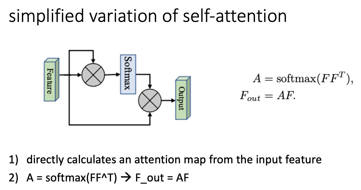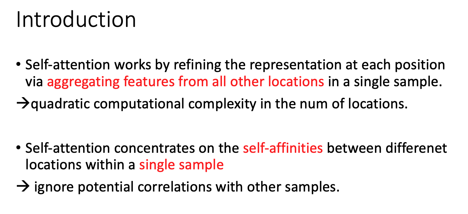 self-attention은 하나의 샘플의 각각의 다른 위치로부터 features를 합하여 각 position을 강조하는 방법이다. 하지만 location의 개수에 따라 제곱으로 computational complexity가 증가한다. 그리고 다른 샘플을 고려하지 않는다는 단점이 있다.