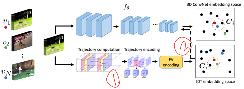 하지만 3D ConvNet의 단점이 2D ConvNet이 spatial정보를 추출하는 만큼 spatial-temporal 정보를 추출하지 못한다. 특히, 유사한 배경에 다른 행동을 취하는 동영상일 경우 동일한 class가 나오는 경우가 있다. 따라서 dense trajectory를 이용해 행동을 encode한다.